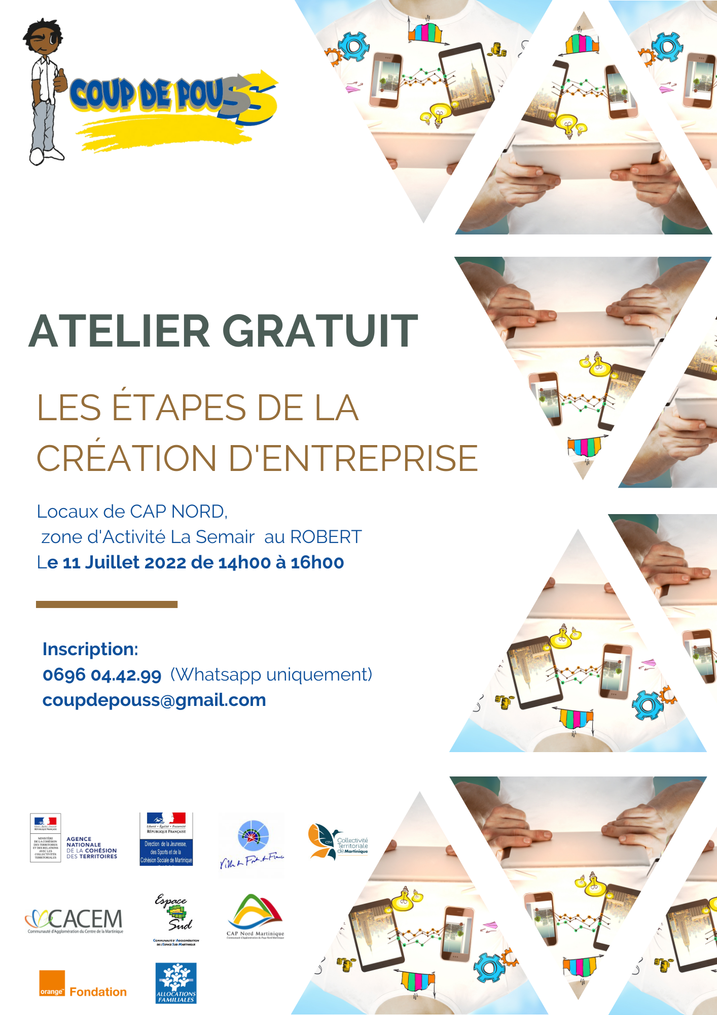 L’association COUP DE POUSS, animera le lundi 11 Juillet 2022, de 14h00 à 16h00 un atelier sur les « Étapes de la Création d’entreprise » dans les locaux de CAP NORD au Robert.
